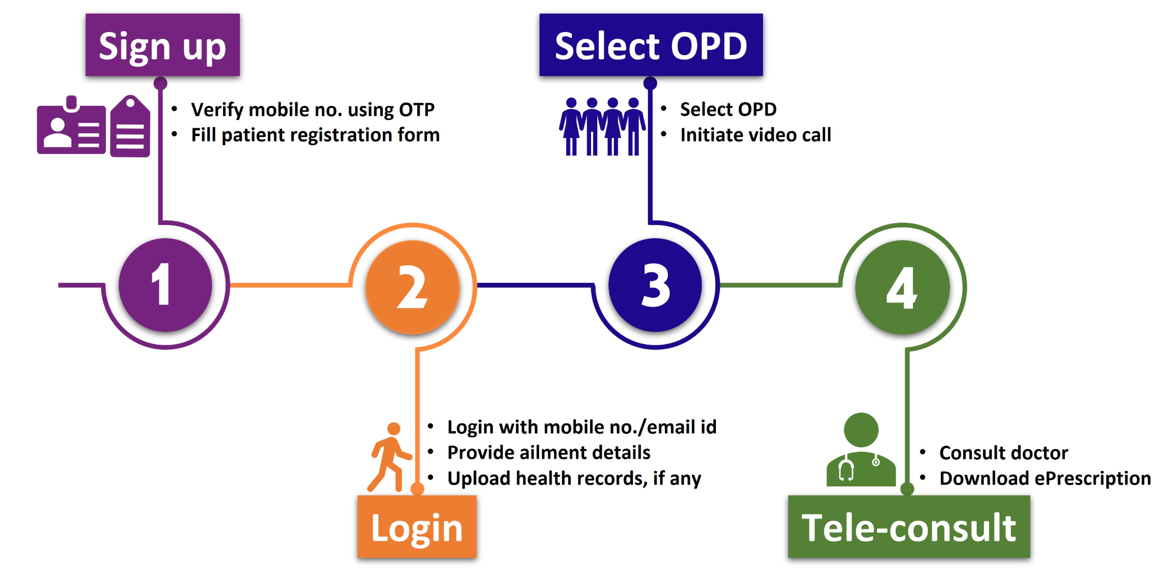 - Patient registers → receives token → waits in virtual queue → doctor consults → prescription issued